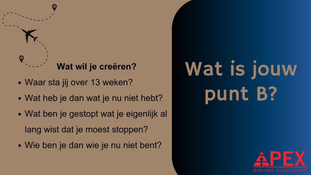 Tijdens dit traject wordt er een nieuwe toekomst gegenereerd. Het enige wat tussen jou en je doel staat, is het verhaal dat je jezelf blijft vertellen waarom je het niet kunt bereiken. Je bent krachtiger dan je denkt, en je kunt meer bereiken dan je ooit voor mogelijk hebt gehouden. Wij gaan jou helpen samen met alle andere Apex Atleten om jouw doelen te verwezenlijken. Succes is niet het einddoel, maar de reis ernaartoe. Kleine stappen leiden tot grote veranderingen. Laten we samen genieten van de reis.